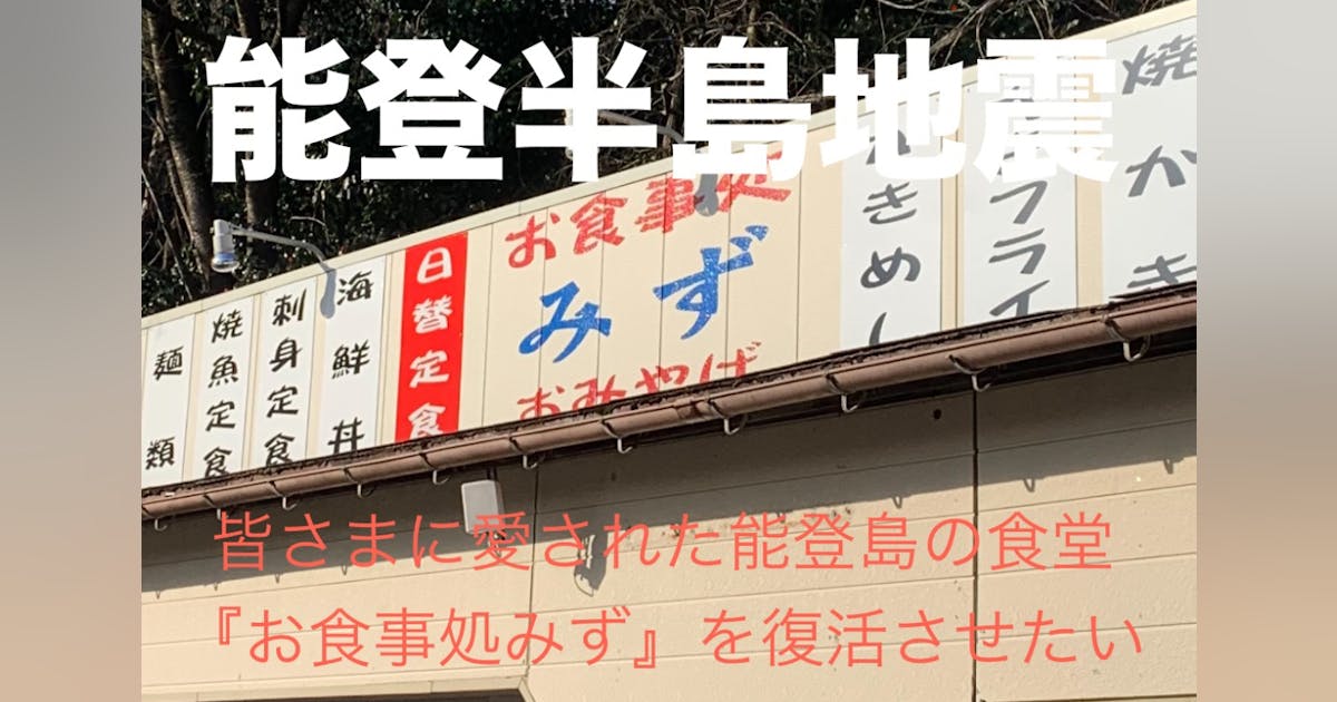 能登島大橋を渡ってすぐにあるご飯屋さん『お食事処みず』がこの度の地震により大きな被害を受けました。最初は店を畳むことも考えましたが、皆さまからたくさんの温かいお言葉を受け、新しいスタートを切りたいと思いました。しかし、復旧するためにはとんで...